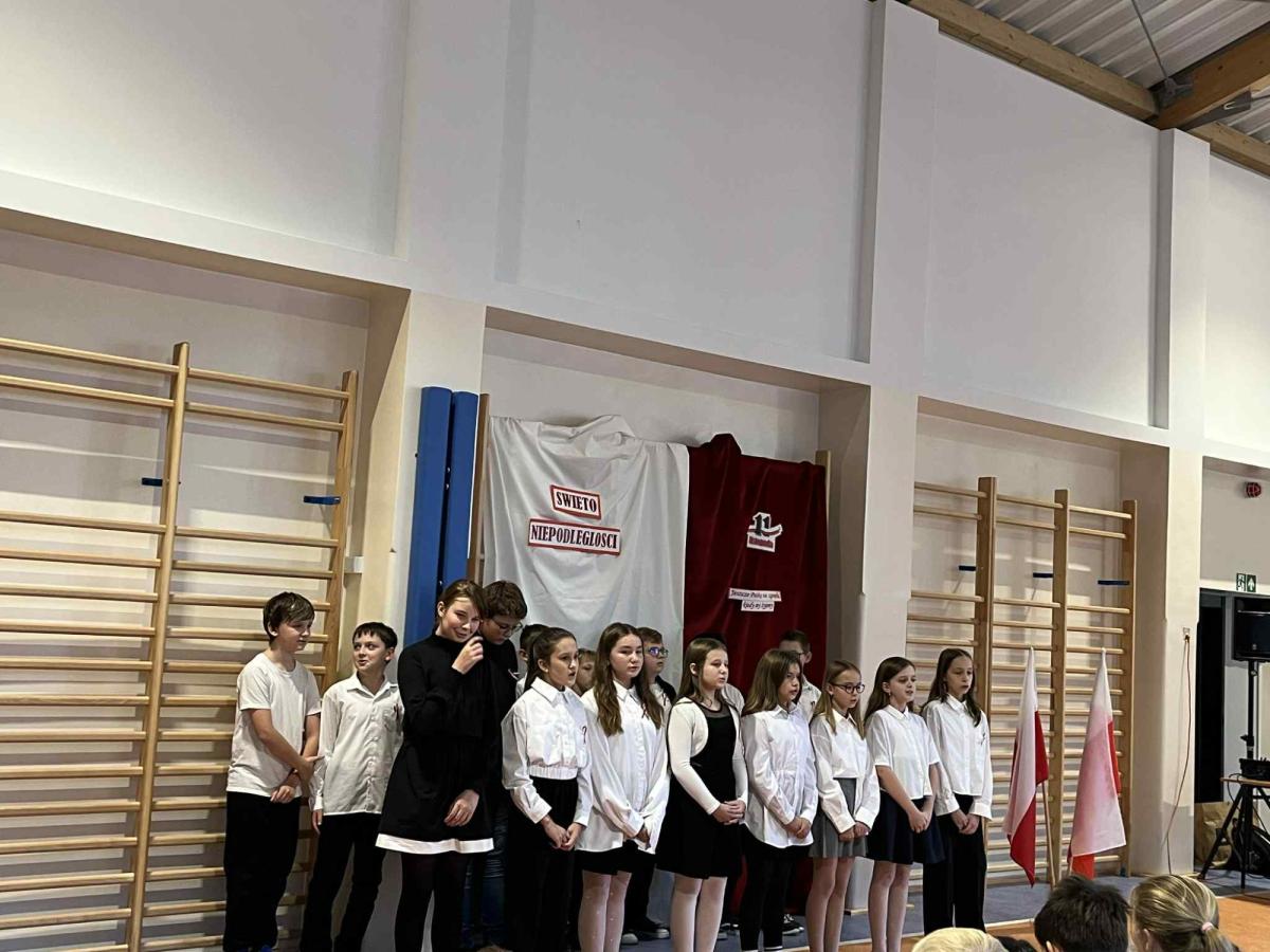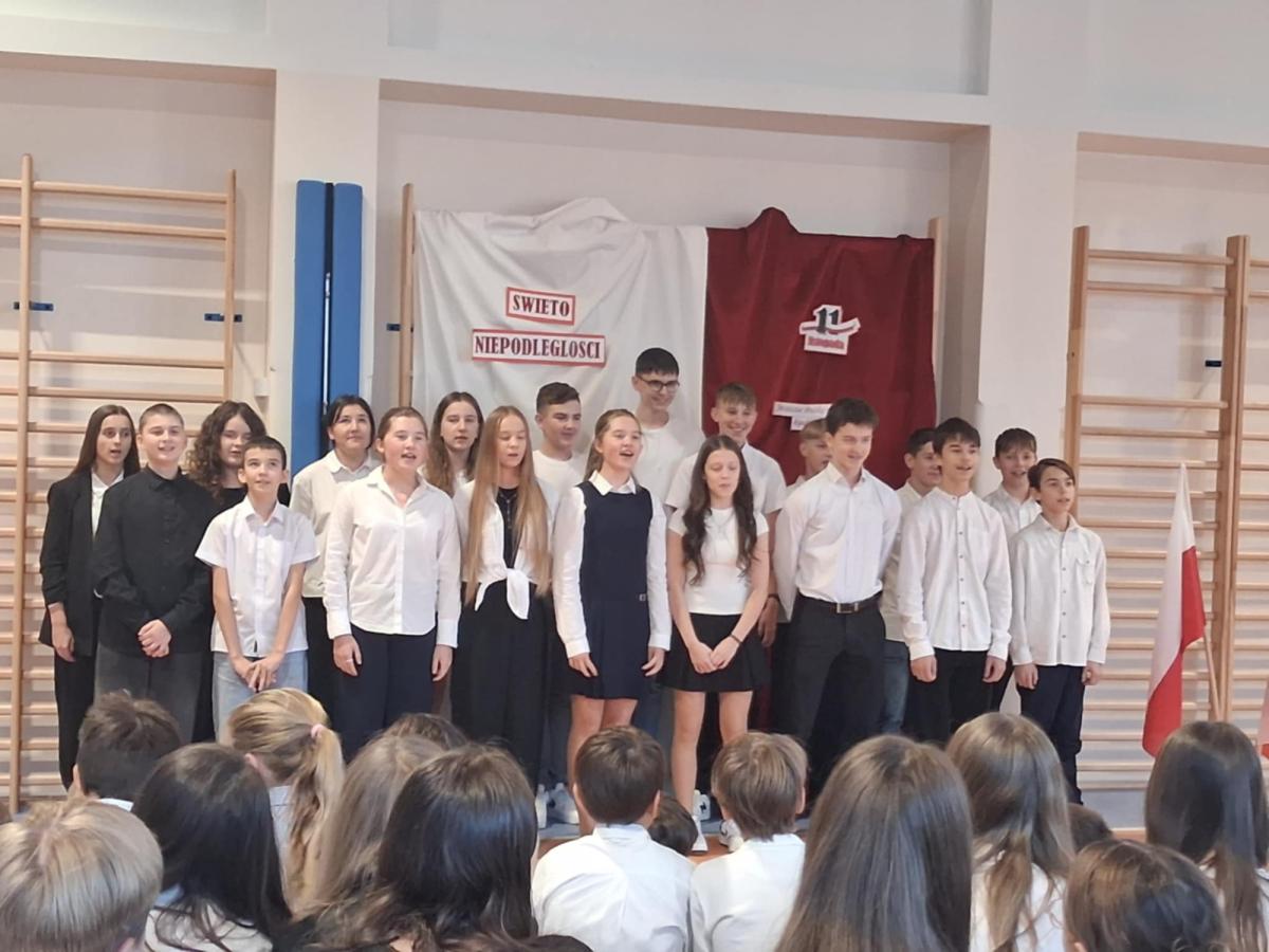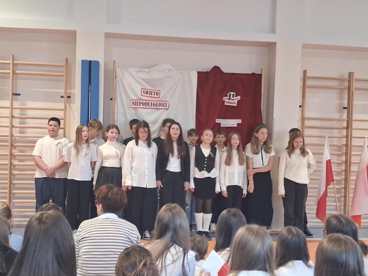 Wszyscy uczniowie w odświętnych strojach z przypiętymi kotylionami odśpiewali hymn narodowy „Mazurek Dąbrowskiego”, a następnie w ciszy i skupieniu wysłuchali części artystycznej.