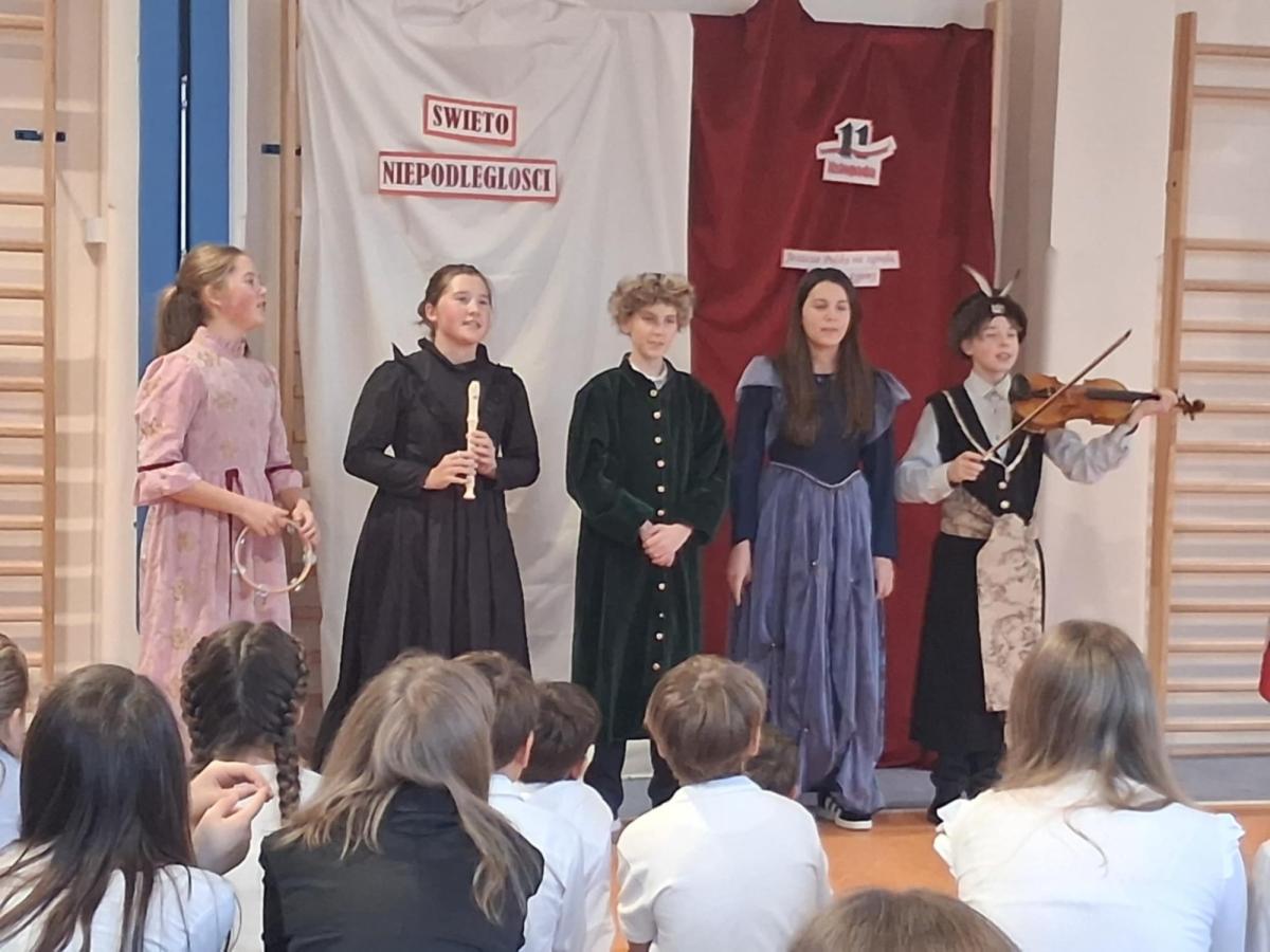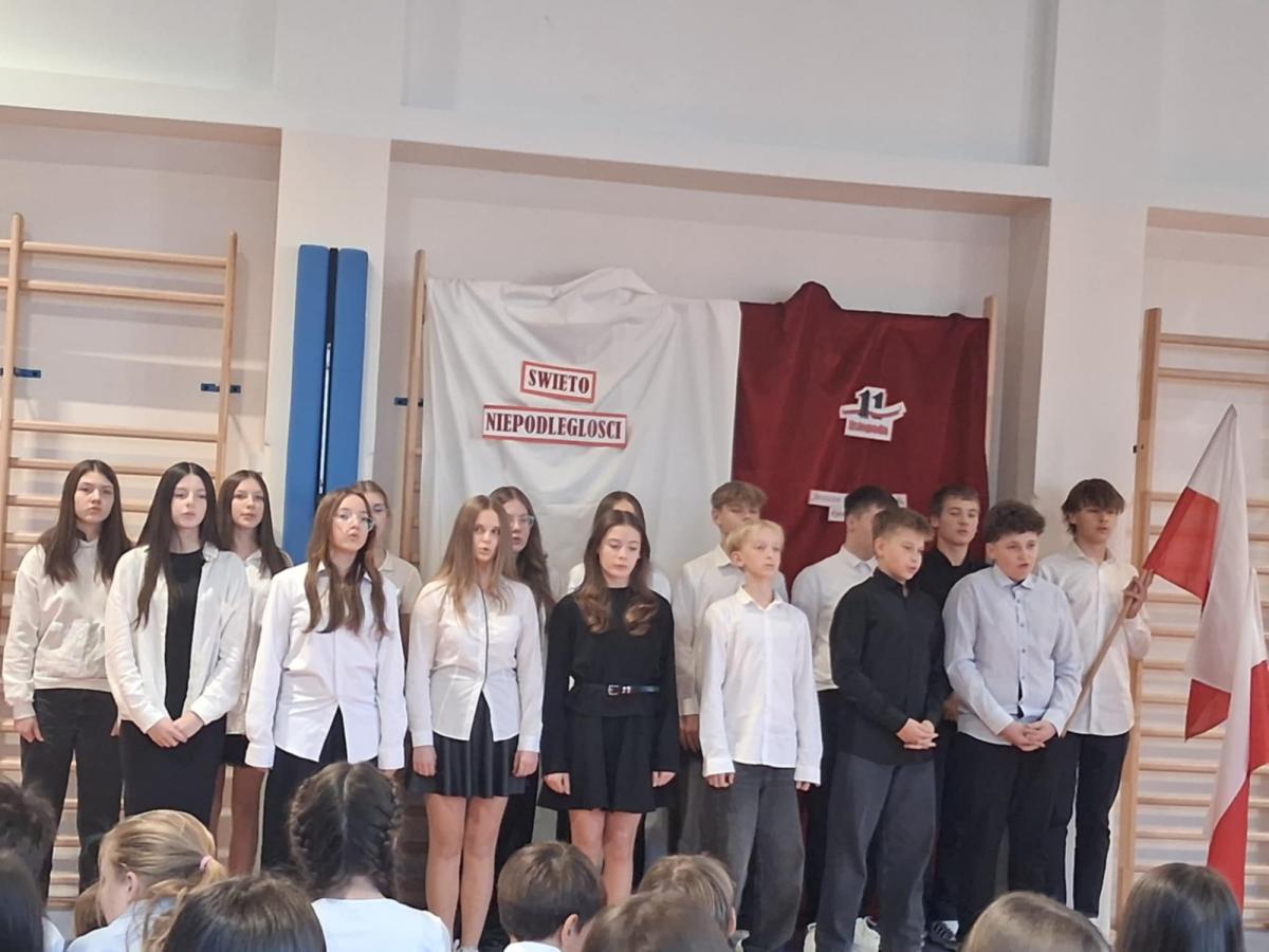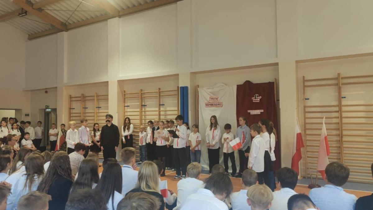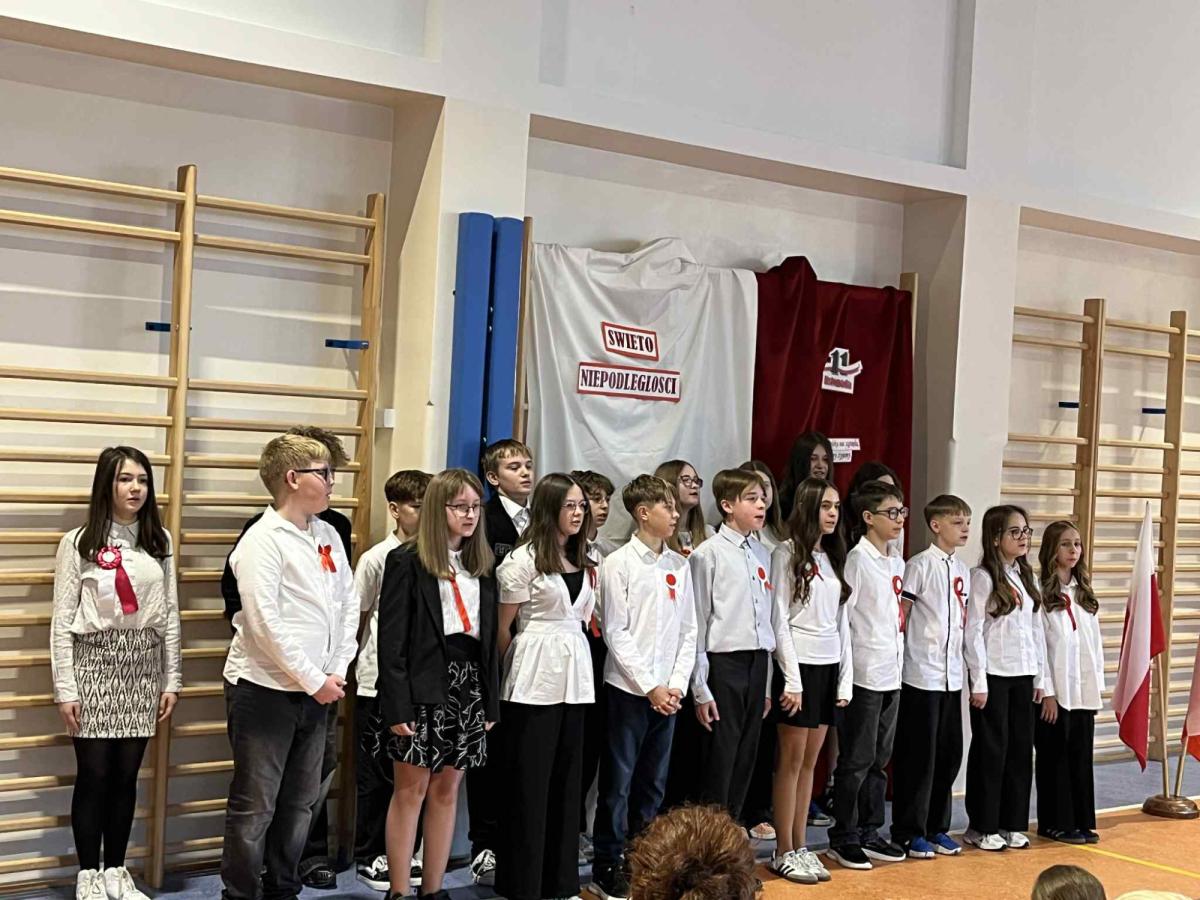Wszyscy uczniowie w odświętnych strojach z przypiętymi kotylionami odśpiewali hymn narodowy „Mazurek Dąbrowskiego”, a następnie w ciszy i skupieniu wysłuchali części artystycznej.