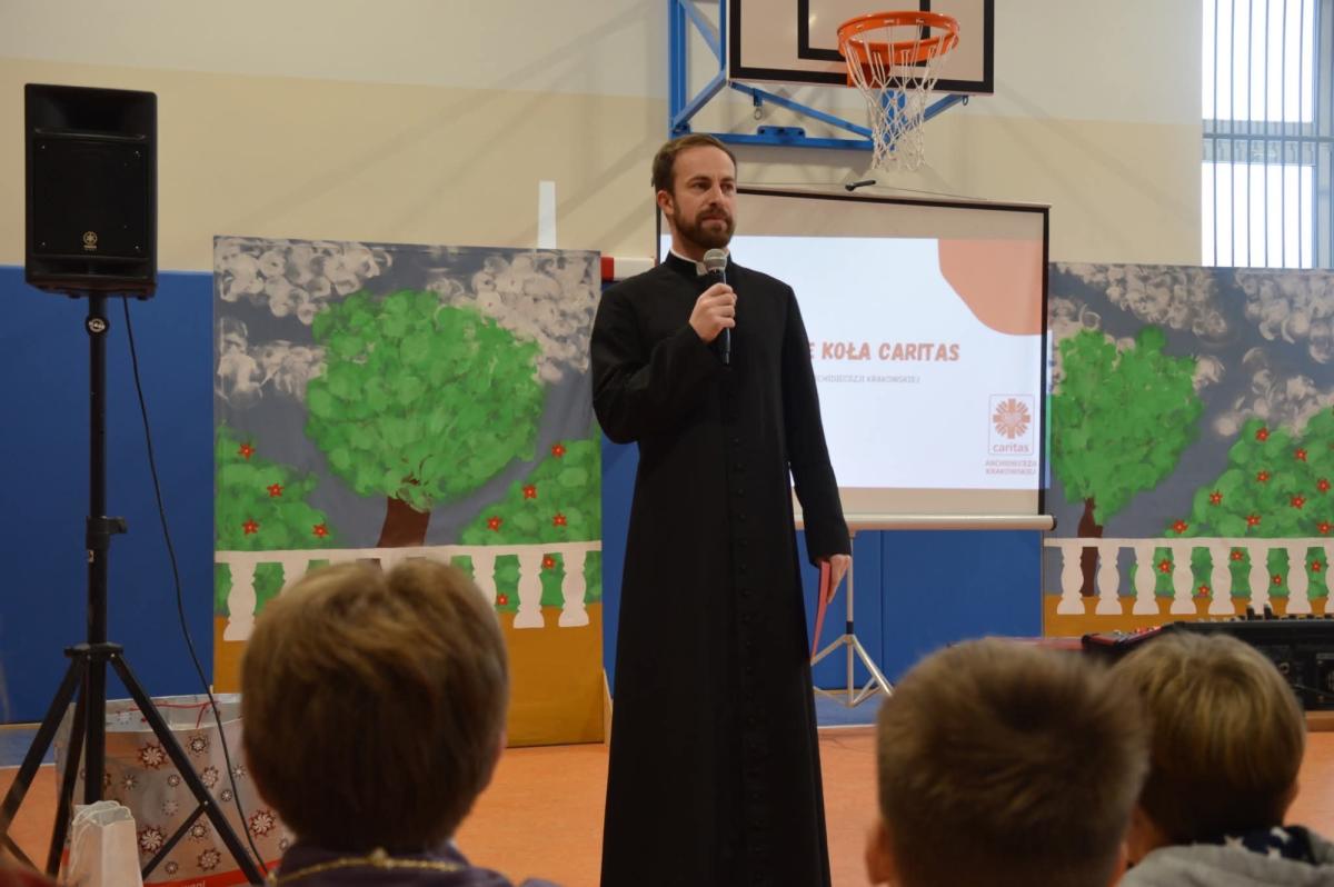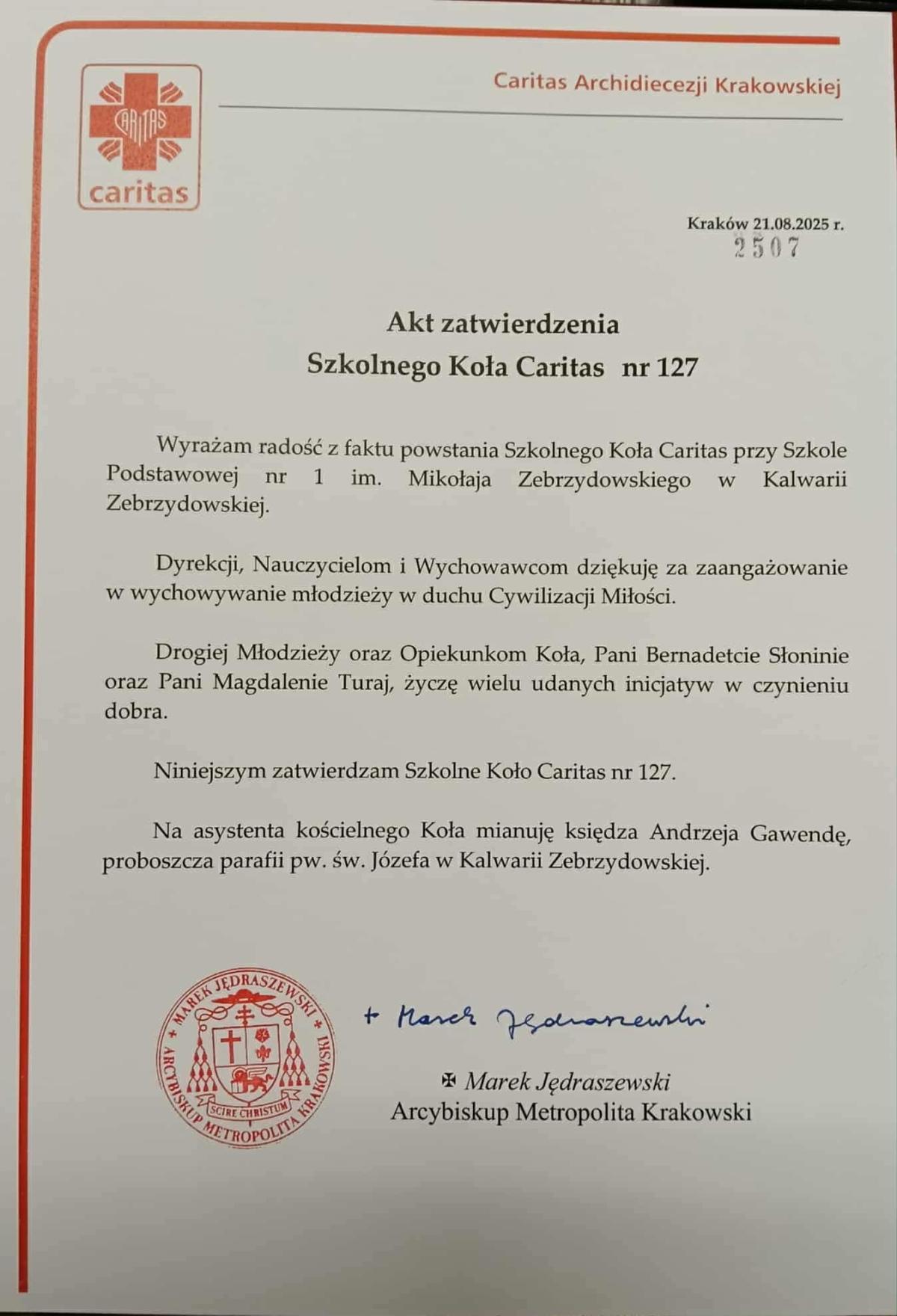 We wtorek, 25 listopada, gościliśmy w naszej Szkole ks. Bartosza Zaborowskiego, wicedyrektora Caritas Archidiecezji Krakowskiej i panią Dorotę Suder, którzy podczas uroczystego spotkania z klasami V-VII przekazali na ręce p.Dyrektor Marii Mlak Akt zatwierdzający powołanie Szkolnego Koła Caritas Powstanie SKC zatwierdził abp Marek Jędraszewski 21 sierpnia.