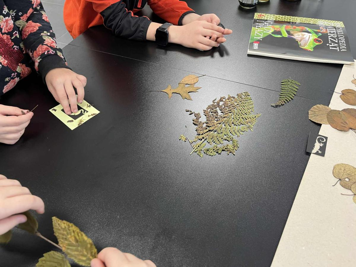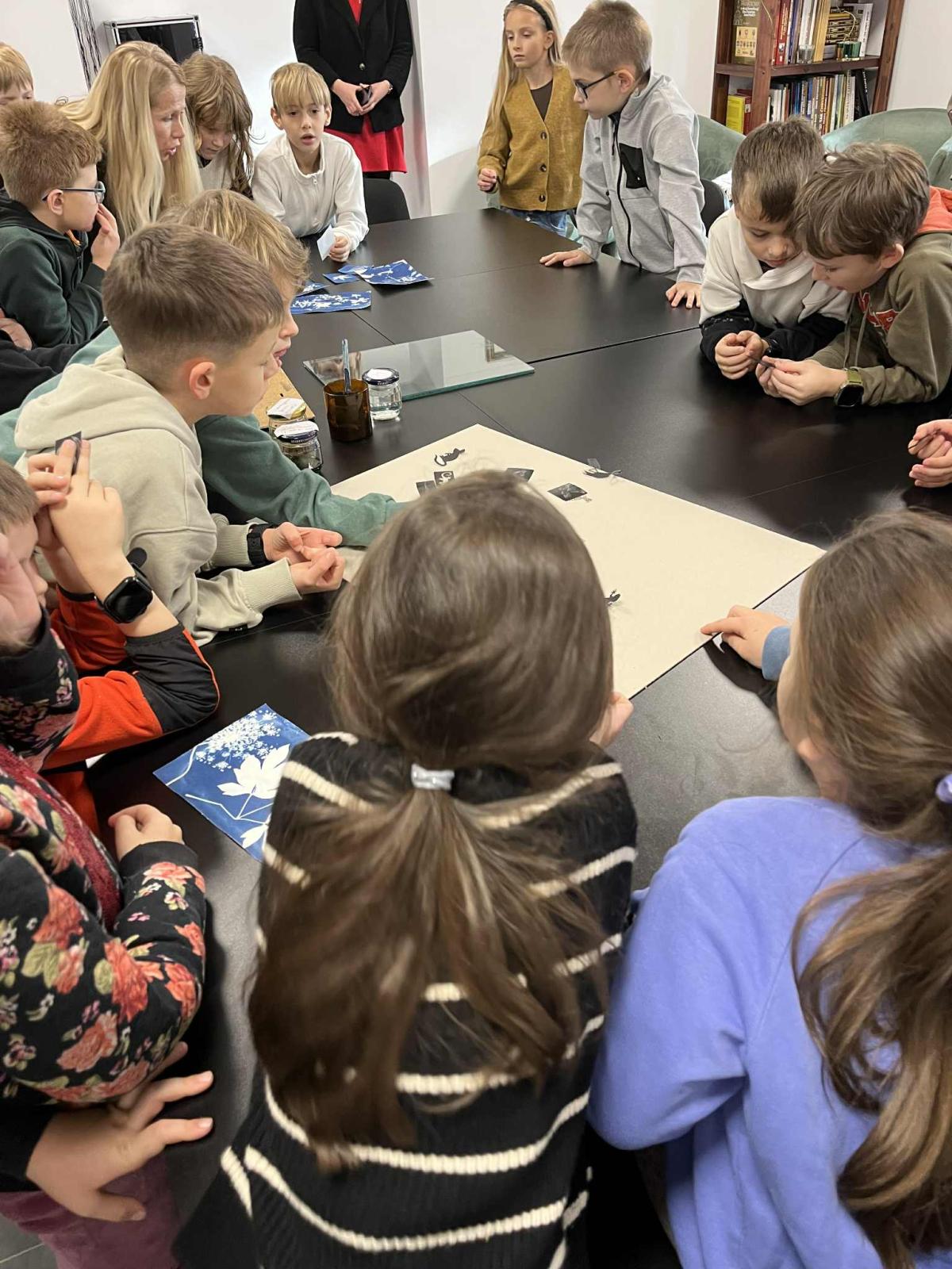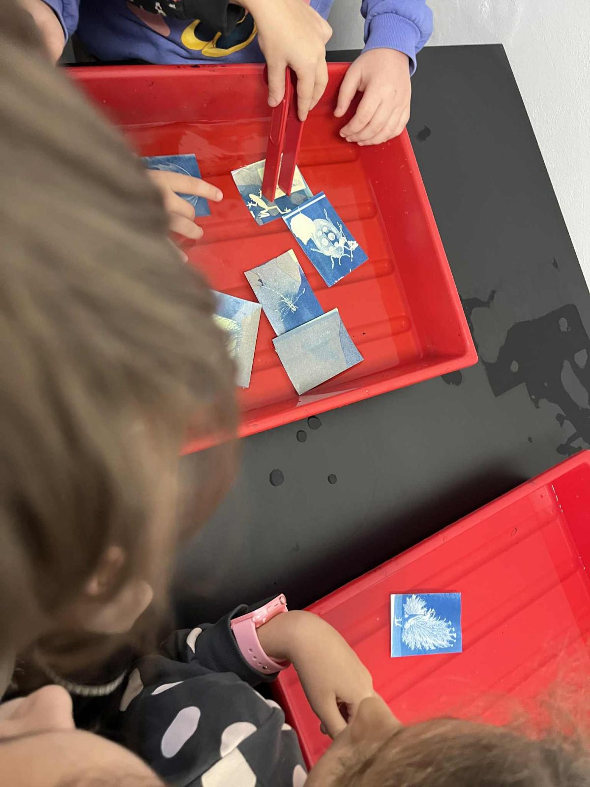 Uczniowie poznali jedną z najstarszych technik fotograficznych, która pozwala tworzyć obrazy przy użyciu światła słonecznego. Samodzielnie dobierali rośliny, liście i przygotowane szablony, które układali na papierze światłoczułym, tworząc własne kompozycje. Był to moment na rozwijanie kreatywności i eksperymentowania z formą. Gotowe kompozycje zostały wystawione na działanie światła, a po kilku minutach uczniowie obserwowali, jak powstaje ich obraz. Po naświetleniu dzieci płukały prace w wodzie, co powodowało uwidocznienie błękitnego koloru. Był to bardzo efektywny i ekscytujący etap. Wysuszone odbitki uczniowie zabrali na pamiątkę.