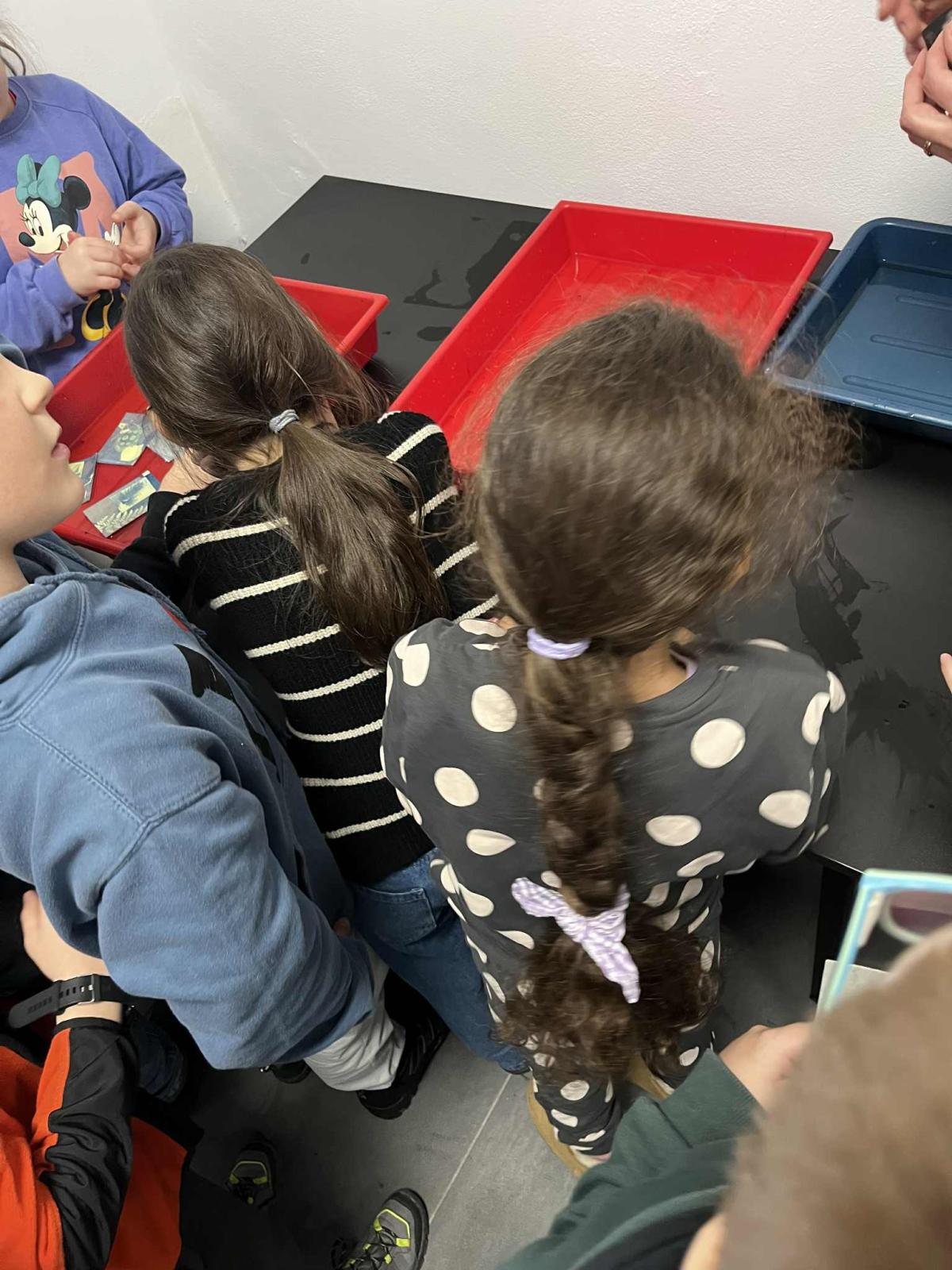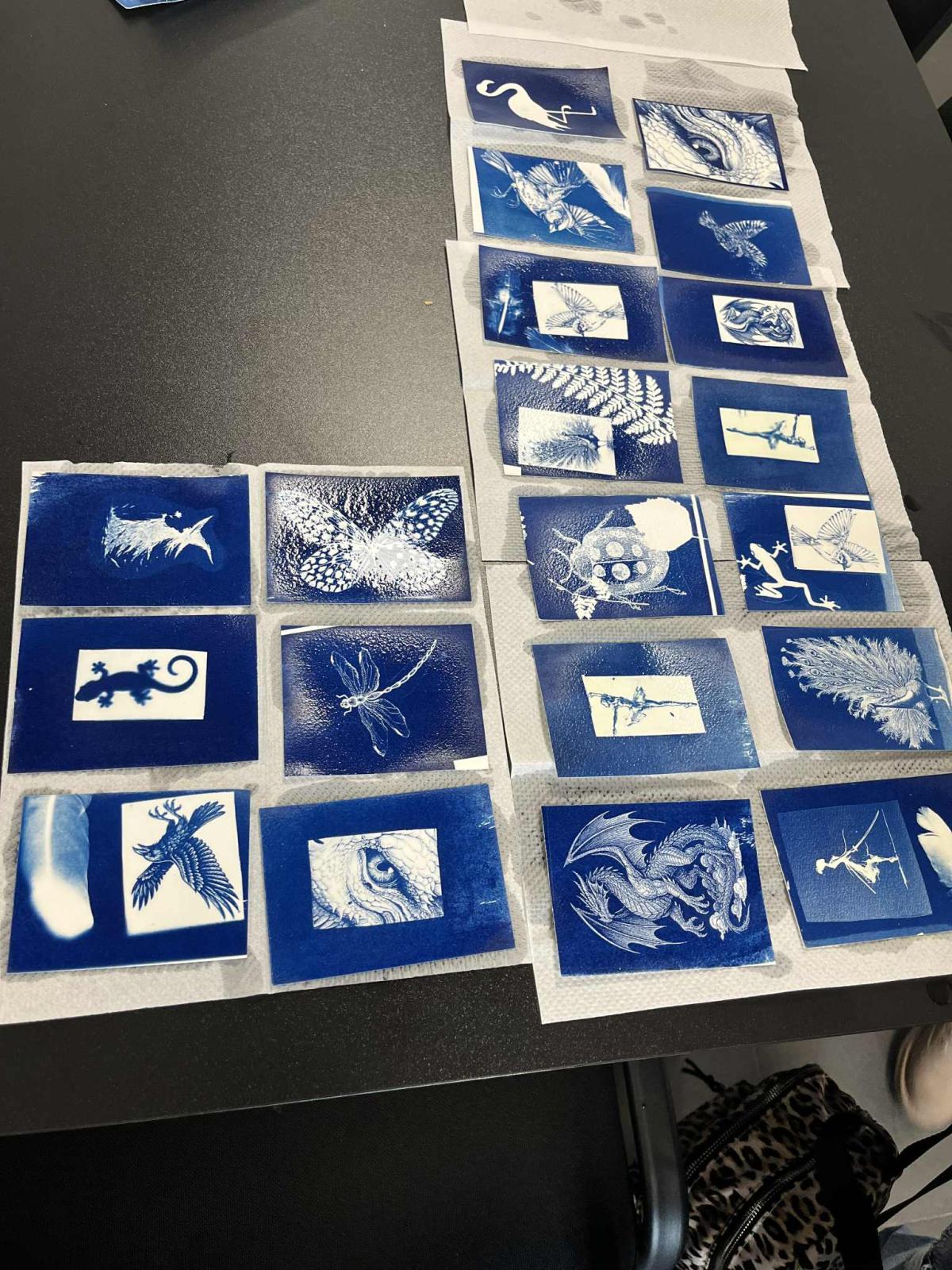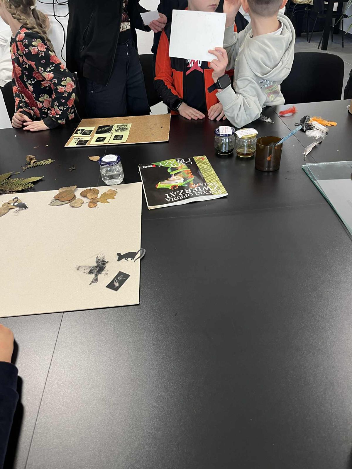 Uczniowie poznali jedną z najstarszych technik fotograficznych, która pozwala tworzyć obrazy przy użyciu światła słonecznego. Samodzielnie dobierali rośliny, liście i przygotowane szablony, które układali na papierze światłoczułym, tworząc własne kompozycje. Był to moment na rozwijanie kreatywności i eksperymentowania z formą. Gotowe kompozycje zostały wystawione na działanie światła, a po kilku minutach uczniowie obserwowali, jak powstaje ich obraz. Po naświetleniu dzieci płukały prace w wodzie, co powodowało uwidocznienie błękitnego koloru. Był to bardzo efektywny i ekscytujący etap. Wysuszone odbitki uczniowie zabrali na pamiątkę.