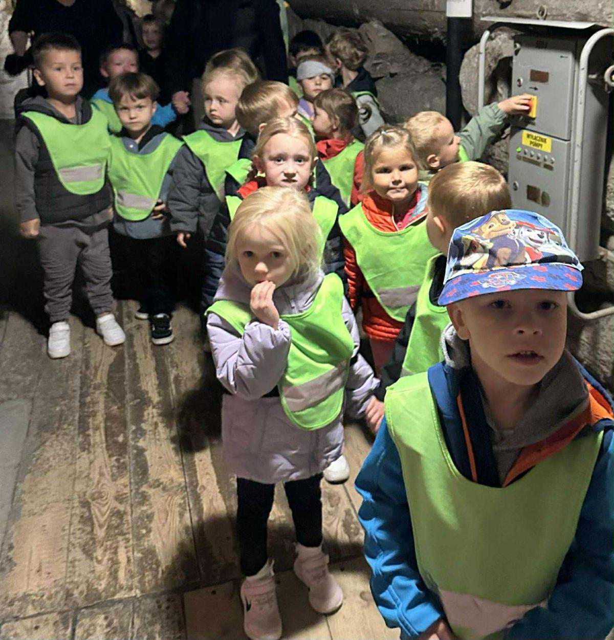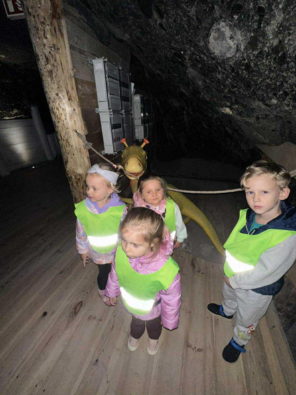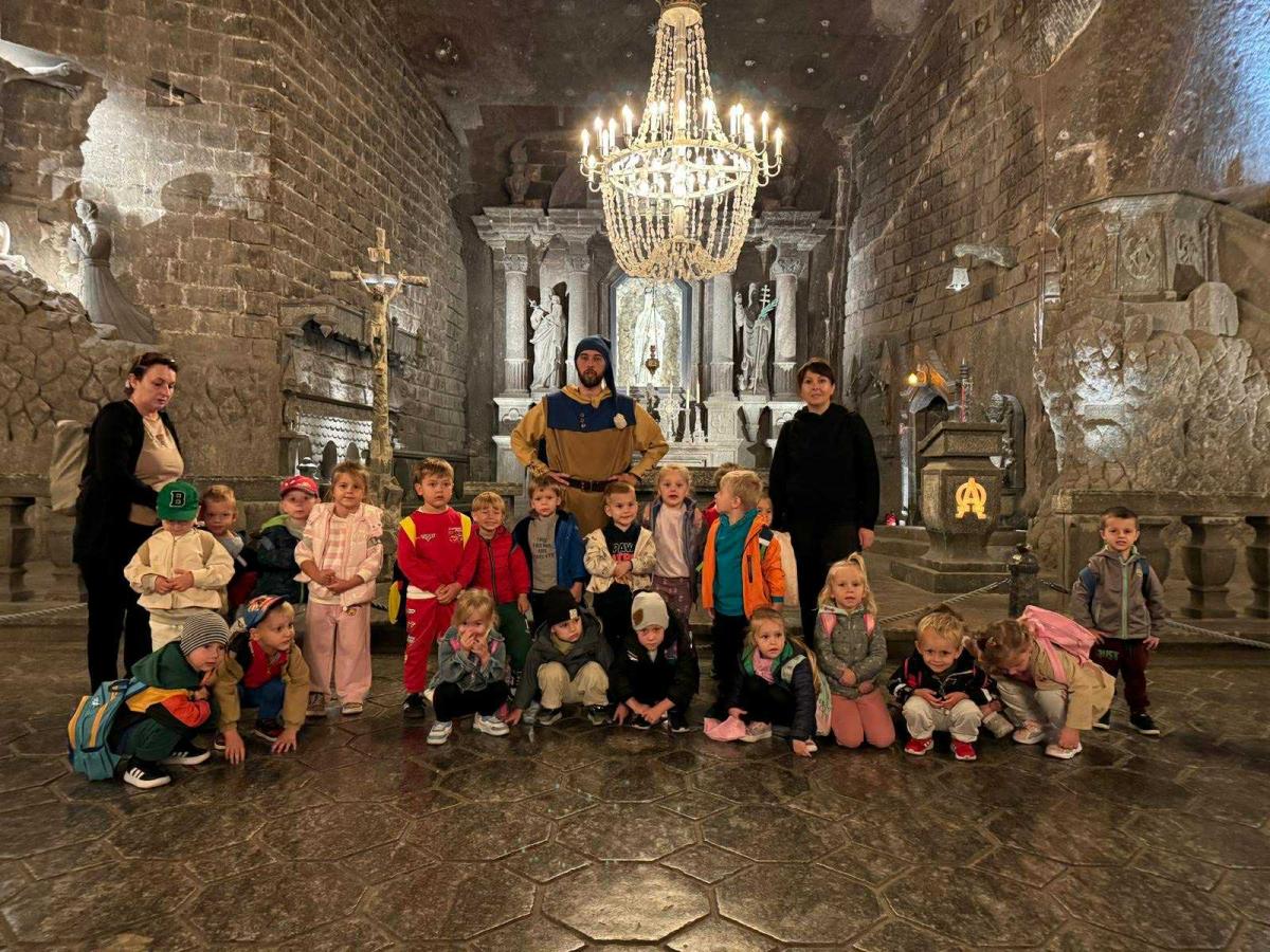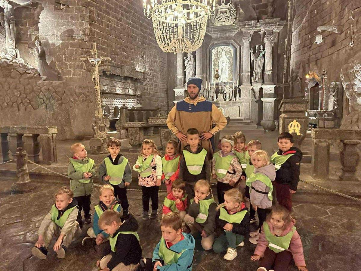 Za siedmioma korytarzami, za siedmioma tunelami znajduje się podziemna kraina dziecięcej wyobraźni - bajkowa Solilandia. W Dniu 18 września 2025 roku przedszkolaki z grup: Motylki, Pszczółki, Mrówki, 0A- oddział integracyjny, wraz z paniami wybrały się na wycieczkę do Kopalni Soli w Wieliczce. Podróż minęła szybko.Przemierzaliśmy kopalnie licznymi korytarzami. We wnętrzu kopalni dzieci wysłuchały legendę o świętej Kindze, która przyniosła bogactwo soli na polską ziemię. W czasie zwiedzania solnych komór przedszkolaki obudziły skrzata Soliludka, który oprowadził ich po kopalni, wyznaczył dzieciom zadania do wykonania i zaprowadził do Skarbnika kopalni. Skarbnik mianował Milenkę B.na księżną Kingę, której okazały pierścień wręczył Antoni F. W taki sposób pożegnaliśmy się z magiczną krainą. Zmęczeni, ale zadowoleni wróciliśmy do przedszkola. Ta wycieczka była dla przedszkolaków wspaniałą przygodą.