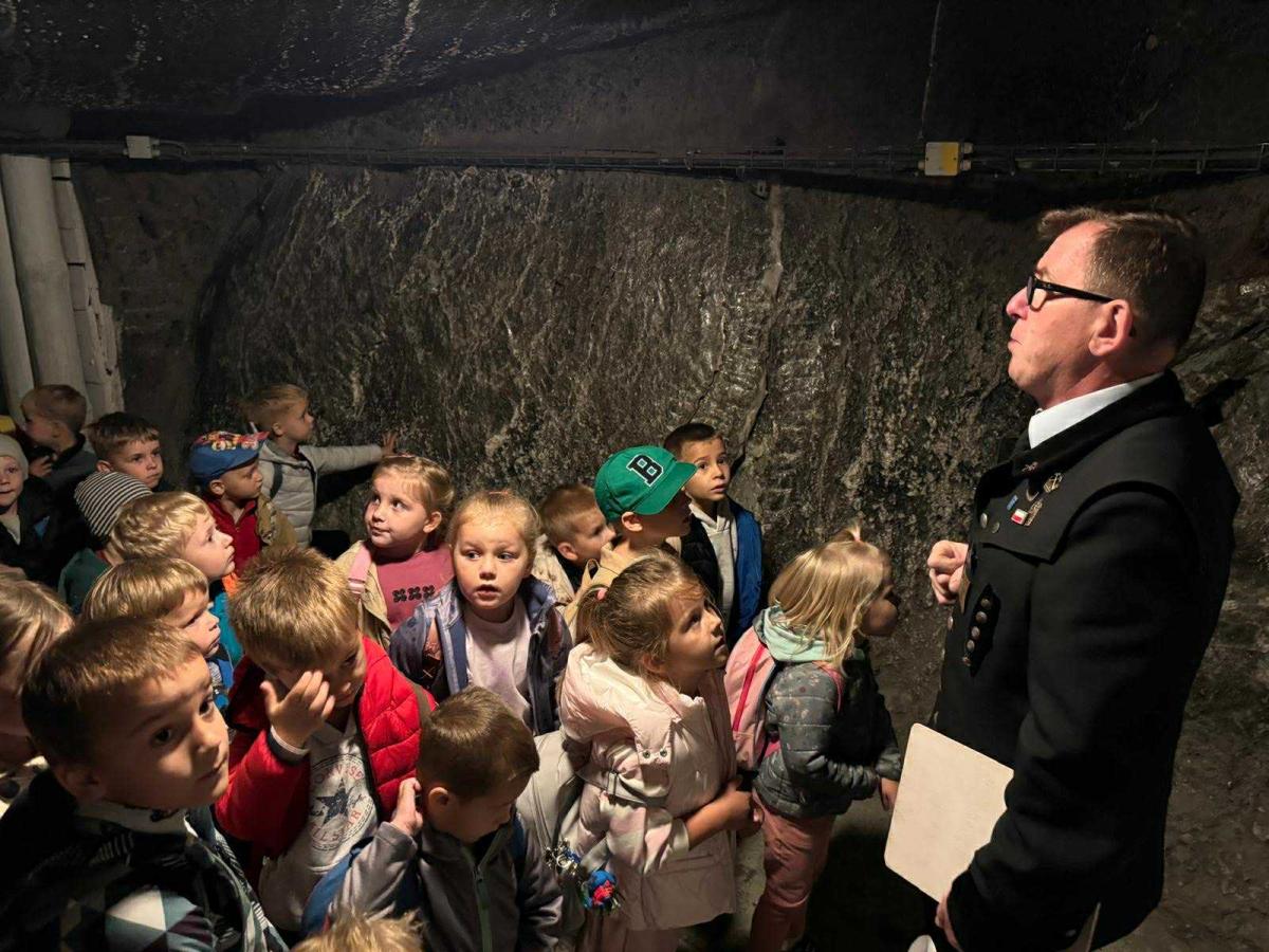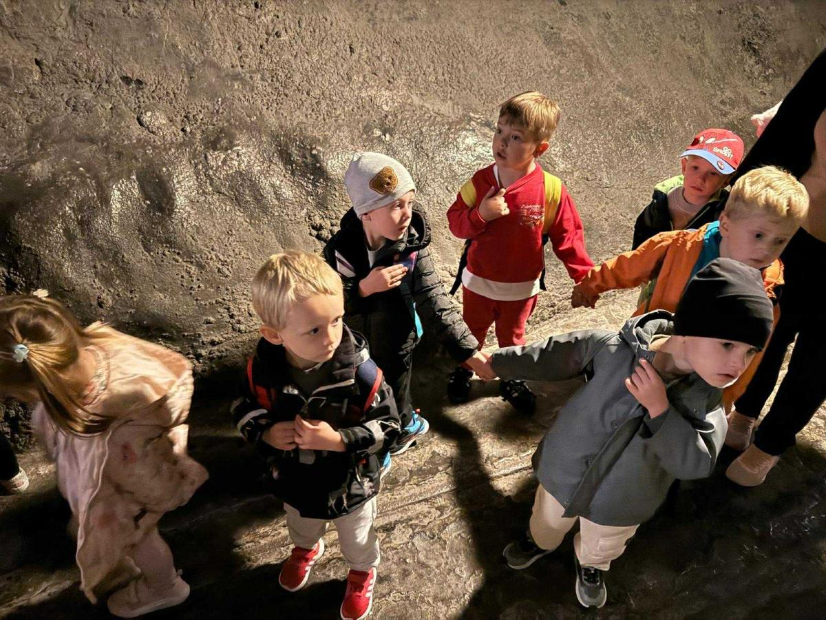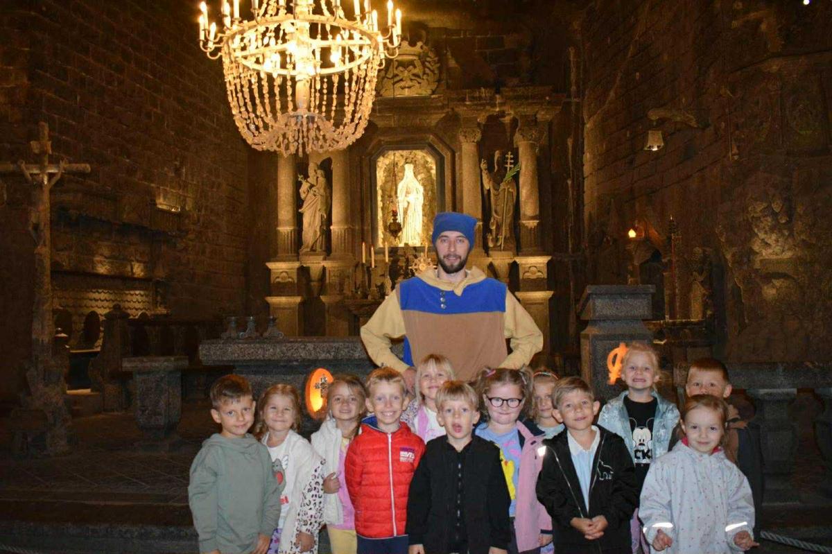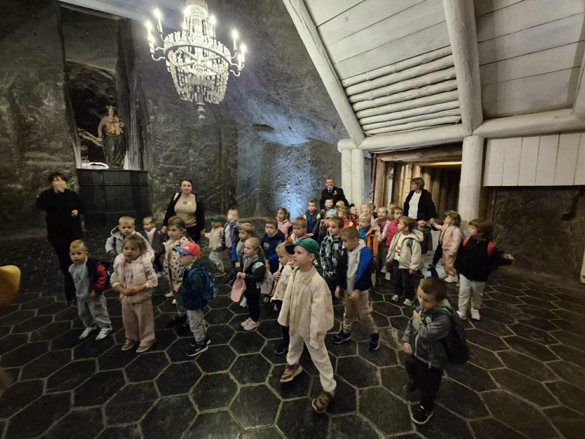 Za siedmioma korytarzami, za siedmioma tunelami znajduje się podziemna kraina dziecięcej wyobraźni - bajkowa Solilandia. W Dniu 18 września 2025 roku przedszkolaki z grup: Motylki, Pszczółki, Mrówki, 0A- oddział integracyjny, wraz z paniami wybrały się na wycieczkę do Kopalni Soli w Wieliczce. Podróż minęła szybko.Przemierzaliśmy kopalnie licznymi korytarzami. We wnętrzu kopalni dzieci wysłuchały legendę o świętej Kindze, która przyniosła bogactwo soli na polską ziemię. W czasie zwiedzania solnych komór przedszkolaki obudziły skrzata Soliludka, który oprowadził ich po kopalni, wyznaczył dzieciom zadania do wykonania i zaprowadził do Skarbnika kopalni. Skarbnik mianował Milenkę B.na księżną Kingę, której okazały pierścień wręczył Antoni F. W taki sposób pożegnaliśmy się z magiczną krainą. Zmęczeni, ale zadowoleni wróciliśmy do przedszkola. Ta wycieczka była dla przedszkolaków wspaniałą przygodą.