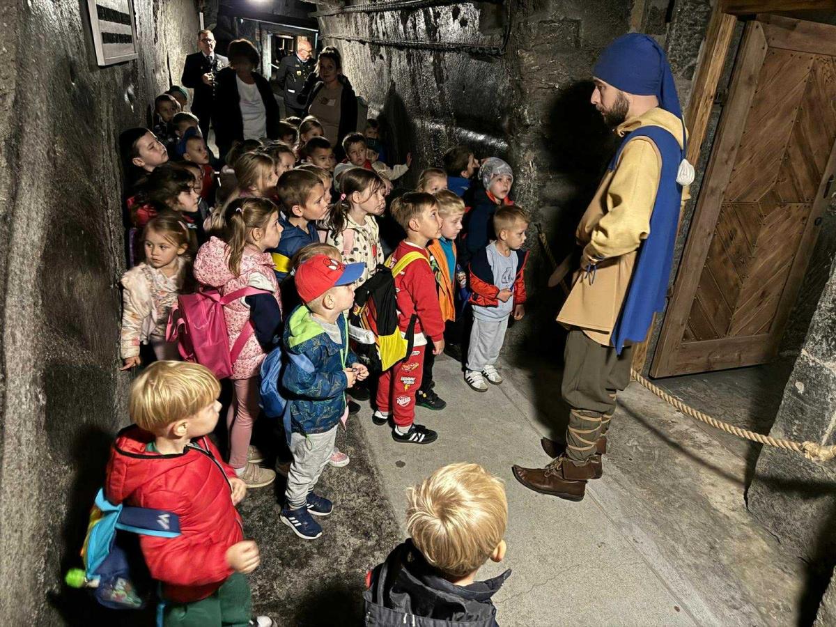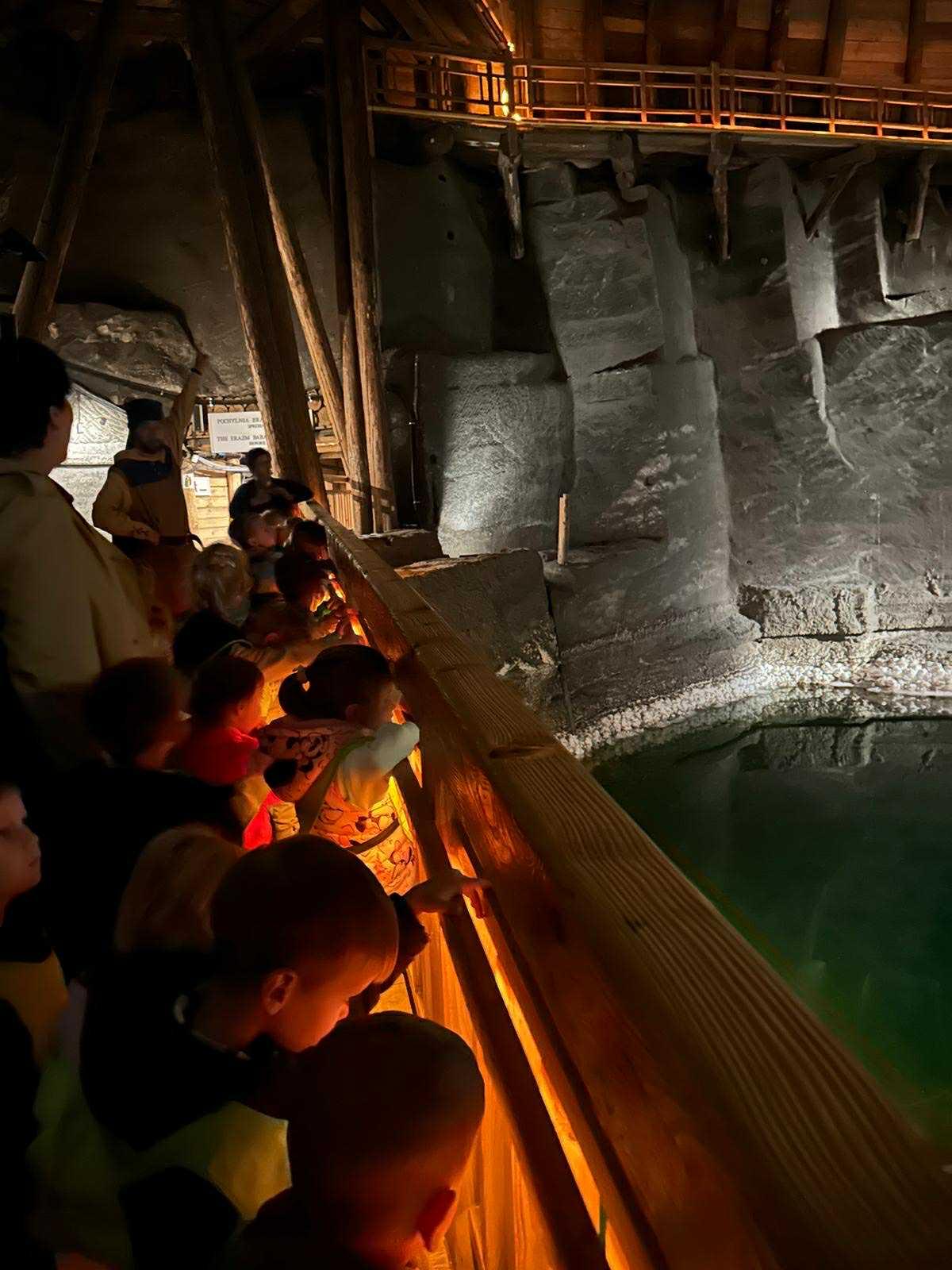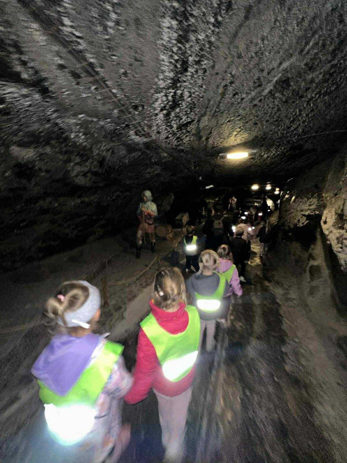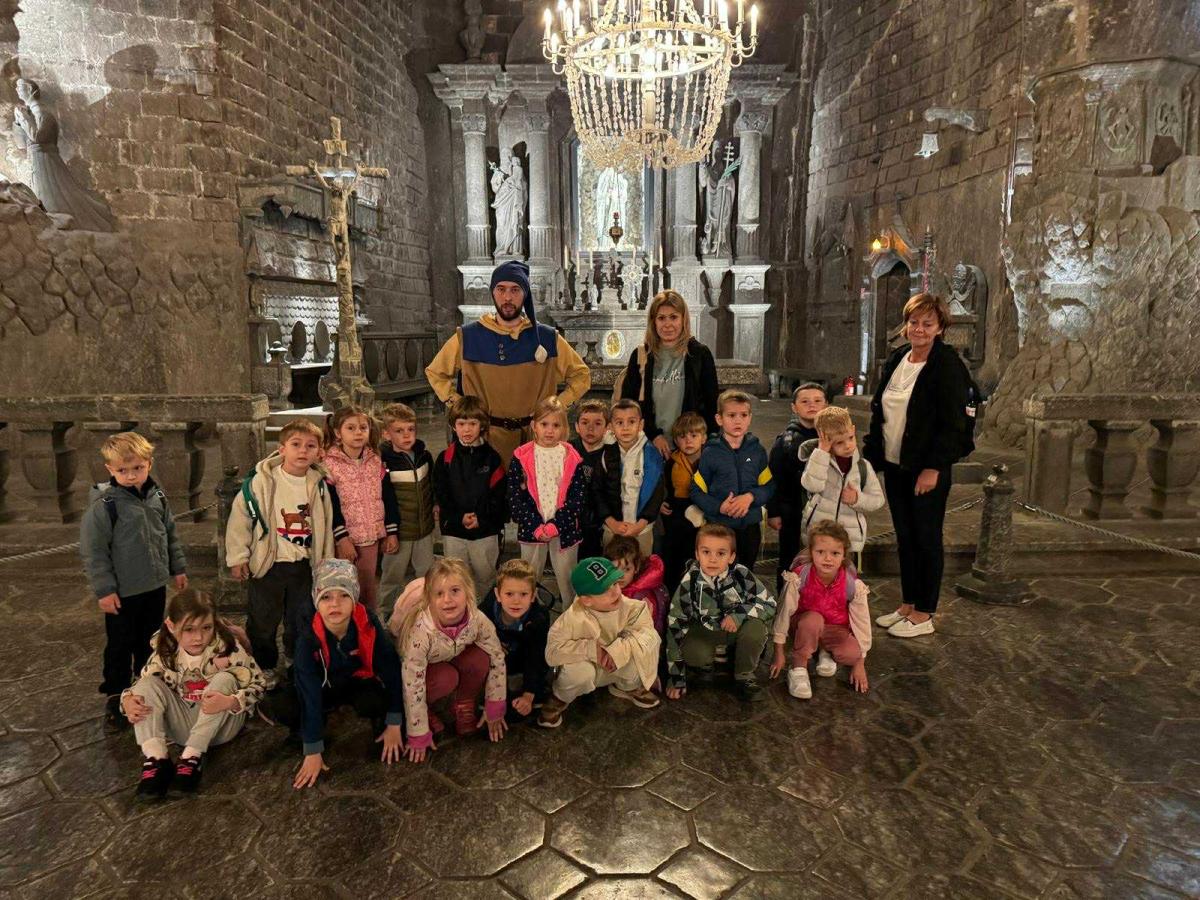Za siedmioma korytarzami, za siedmioma tunelami znajduje się podziemna kraina dziecięcej wyobraźni - bajkowa Solilandia. W Dniu 18 września 2025 roku przedszkolaki z grup: Motylki, Pszczółki, Mrówki, 0A- oddział integracyjny, wraz z paniami wybrały się na wycieczkę do Kopalni Soli w Wieliczce. Podróż minęła szybko.Przemierzaliśmy kopalnie licznymi korytarzami. We wnętrzu kopalni dzieci wysłuchały legendę o świętej Kindze, która przyniosła bogactwo soli na polską ziemię. W czasie zwiedzania solnych komór przedszkolaki obudziły skrzata Soliludka, który oprowadził ich po kopalni, wyznaczył dzieciom zadania do wykonania i zaprowadził do Skarbnika kopalni. Skarbnik mianował Milenkę B.na księżną Kingę, której okazały pierścień wręczył Antoni F. W taki sposób pożegnaliśmy się z magiczną krainą. Zmęczeni, ale zadowoleni wróciliśmy do przedszkola. Ta wycieczka była dla przedszkolaków wspaniałą przygodą.